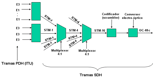 Cada trama va encapsulada en un tipo especial de estructura denominado contenedor. Una vez encapsulados se añaden cabeceras de control que identifican el contenido de la estructura (el contenedor) y el conjunto, después de un proceso de multiplexación, se integra dentro de la estructura STM-1. Los niveles superiores se forman a partir de multiplexar a nivel de byte varias estructuras STM-1, dando lugar a los niveles STM-4,STM-16, STM-64 y STM-256.